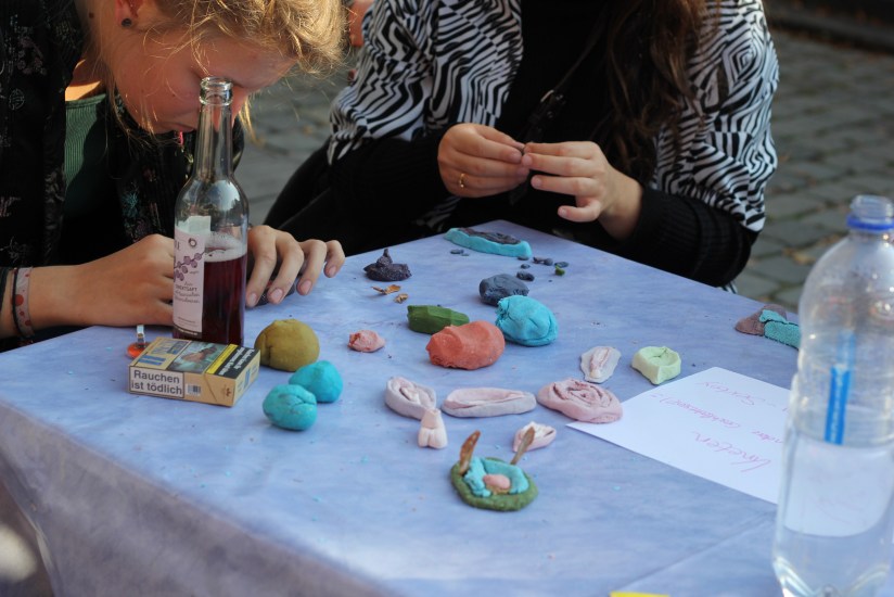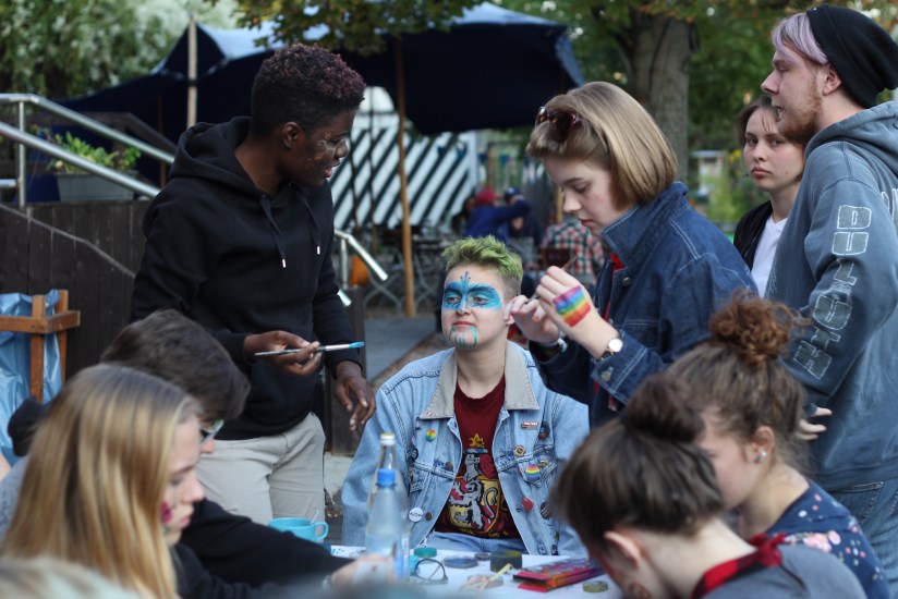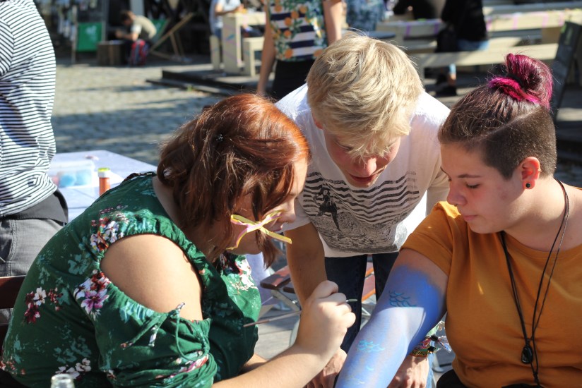 Wir haben wieder unser Rahmenprogramm mitgebracht und neben Snacks und Getränken in der Sonne, gab es erneut die Stationen für Bodypaint, Basteln und Vulven kneten. Diese wurden auch ausgiebig genutzt, sodass am Ende des Abends nahezu alle bunt angemalt waren!