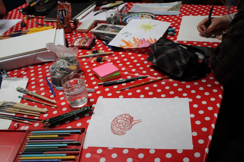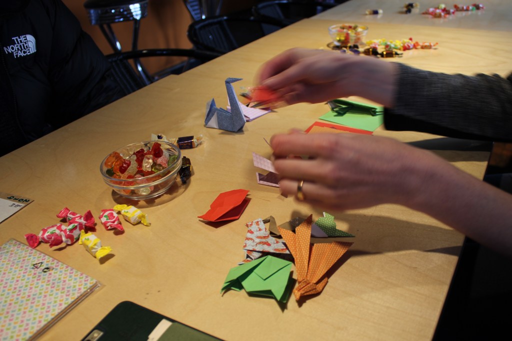 Um das Hirn ein wenig ins Laufen zu bringen, gab es ein volles Angebot an Workshops. Origami, Typographie, Zeichnen und Schreiben, für jeden war etwas dabei . Auch für diejenigen, die sich ausschließlich regulär treffen wollten, gab es eine Überraschung: Es gab Pizza für alle.