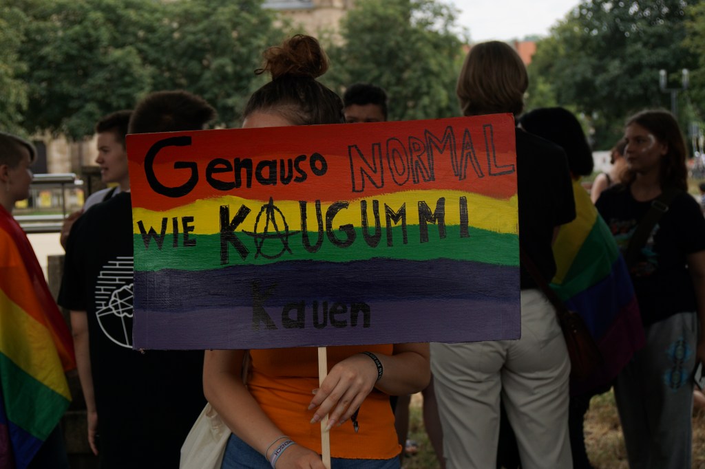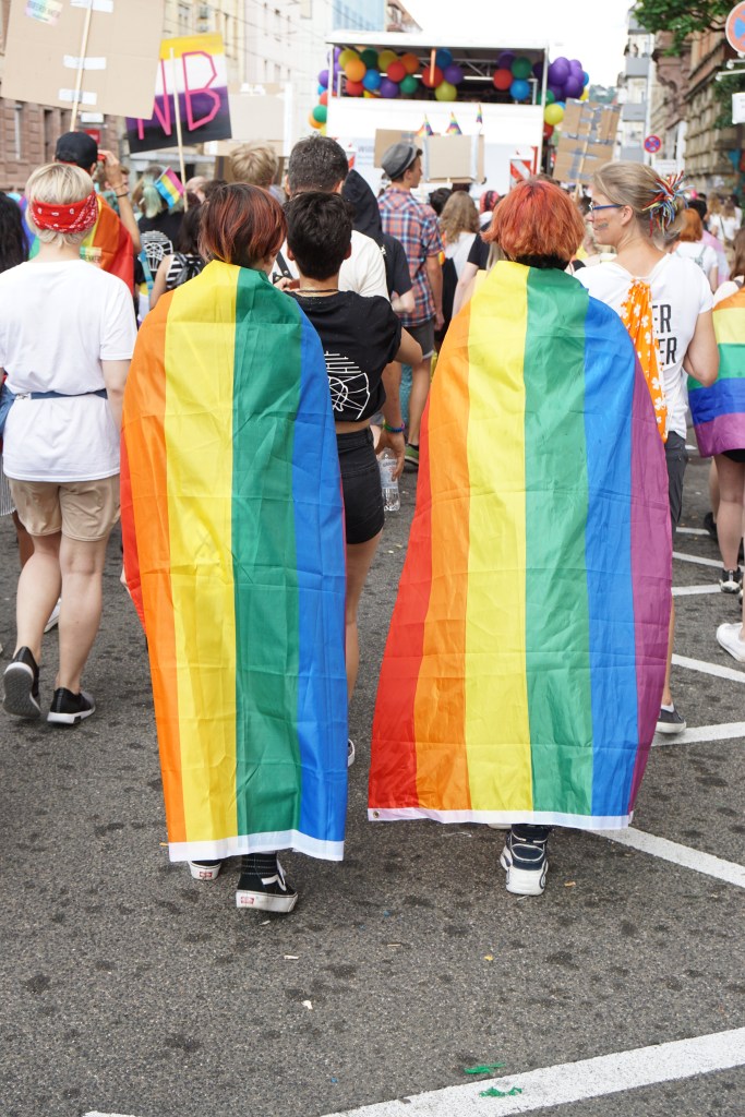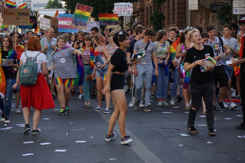 Als wir dann gegen 16.00 Uhr endlich losgelaufen sind, waren wir um die 80 bis 100 Leute. Auf dem Weg zum Schlossplatz sind auch noch mehr wunderbare, bunte Leute dazugestoßen, sodass wir am Ende eine unüberblickbar große Gruppe waren, die für die Gleichberechtigung und Sichtbarkeit der LSBTTIQ+-Community marschiert sind.