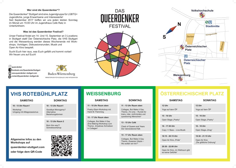 Am 14. und 15. September fand das Queerdenker* Festival in Stuttgart an ganzen drei Locations statt: Dem Österreichischen Platz, der VHS Stuttgart und der Weissenburg. Ziel des Festivals war es Sichtbarkeit, Vielfalt und queeres Leben, ebenso wie das zweijährige Bestehen der Queerdenker* Stuttgart, zu feiern.