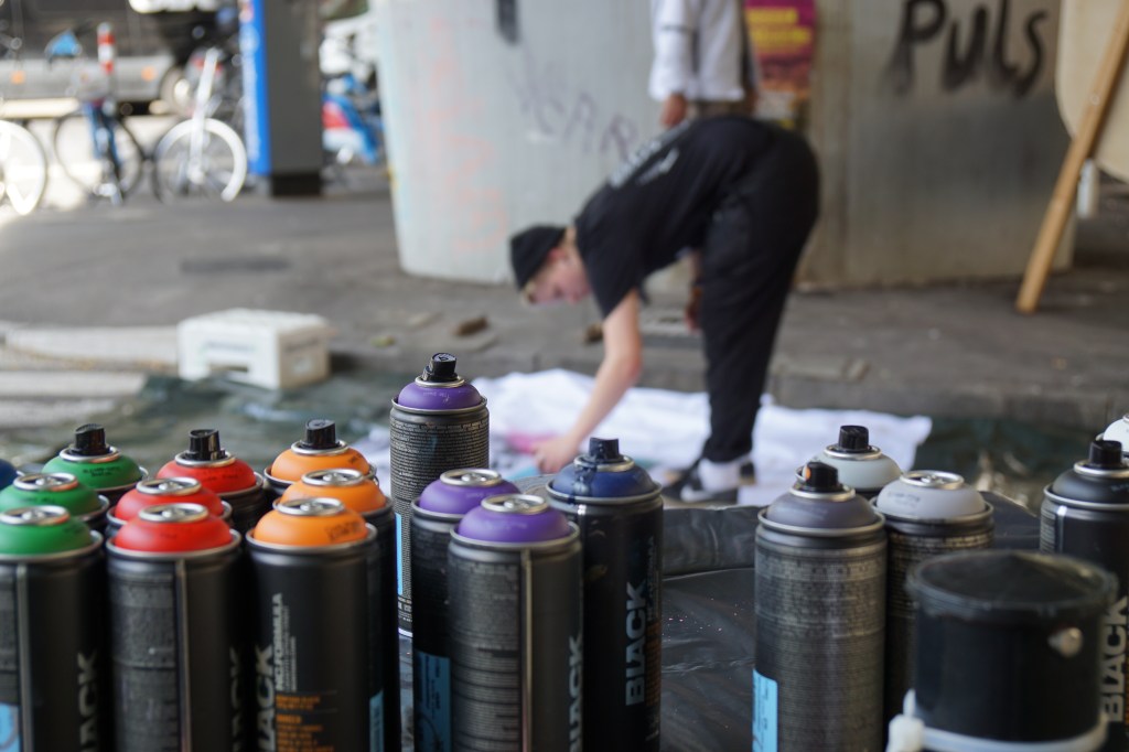 Hier seht Ihr unsere Spray-Station! Mit vielen bunten Farben wurden hier Jute-Beutel und Banner selbst gesprüht.