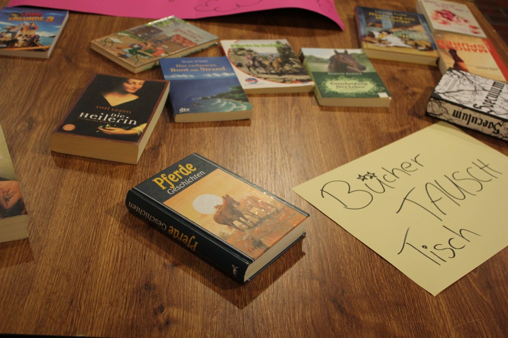 Um die Lesung herum gab es auch einen Büchertausch: Leute konnten alte Bücher mitbringen und sich dafür Neue mitnehmen. Alle Bücher, die nach dem Treffen übrig geblieben sind, werden wir an Oxfam spenden.
