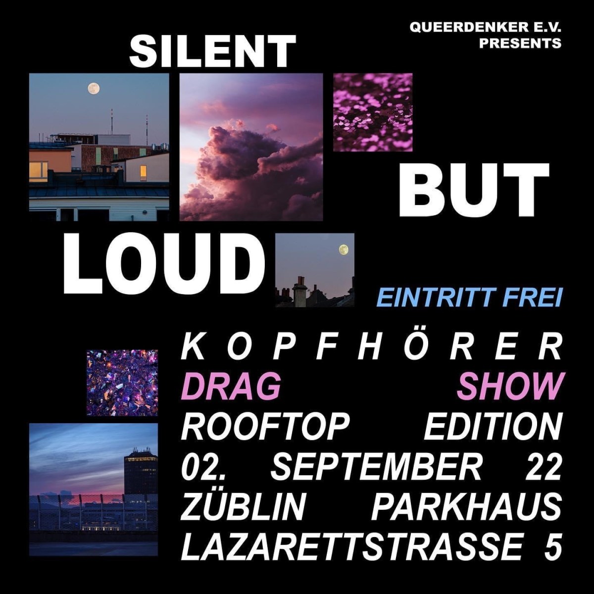 Drag ist bunt und schrill und vor allem eins: laut. Stimmt. Drag funktioniert aber auch als Kopfhörer-Party, sagen wir. Überzeugt euch am besten selbst davon und kommt am 2. September aufs Oberdeck des Züblin-Parkhauses. Dort, open air über den Dächern Stuttgarts könnt ihr die Kopfhörer an und die Welt voller fest erscheinender Geschlechternormen und -erwartungen für einen Moment ausschalten und euch ganz intensiv auf die Performances unserer wundervollen Artists einlassen.