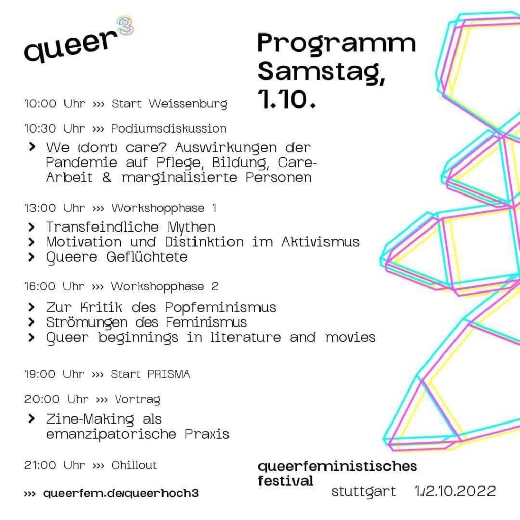 Alle Details findet ihr auf unserem Instagramkanal oder in der Facebookveranstaltung. Hier schon einmal das Programm, sucht euch raus, was euch interessiert! Oder kommt eifach so vorbei zum Entspannen, Austauschen, Lesen, Musikhören oder Partymachen!